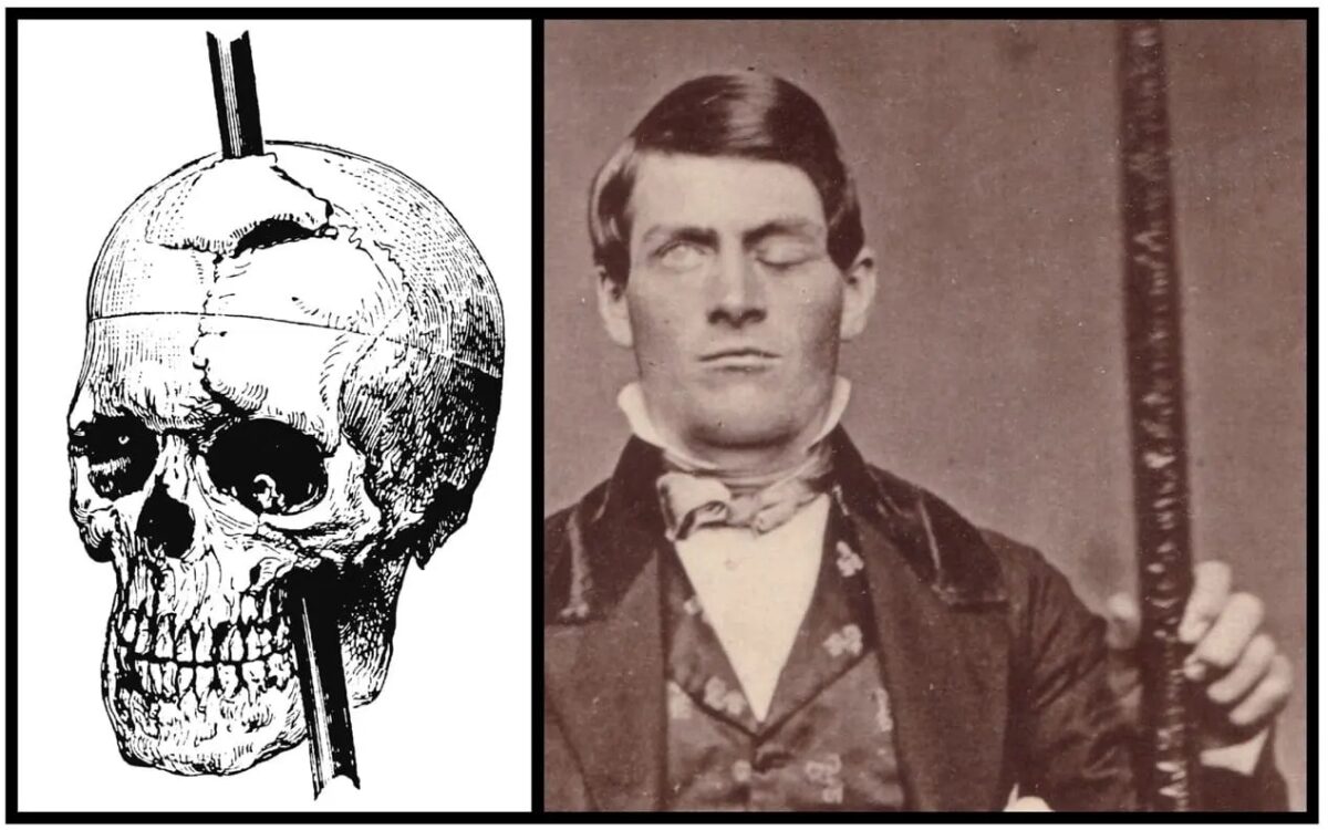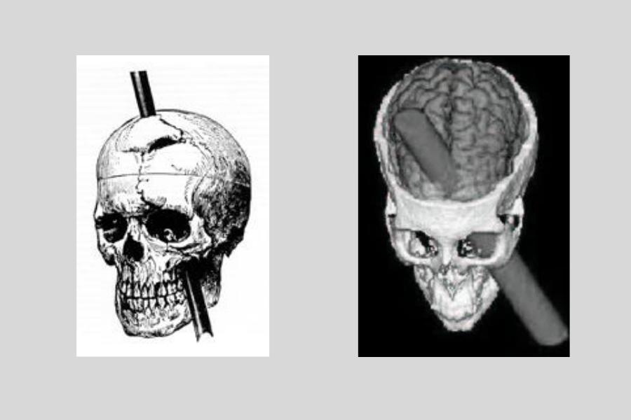 ある日、爆薬を岩に詰める作業をしているときに事故が起こります。爆薬を押し固めるための長さ1m以上、重さ6kgの鉄の棒が爆発の衝撃で吹き飛び、なんとゲージの左頬から頭を突き抜けて、前頭部の頭蓋骨を貫通してしまったのです。